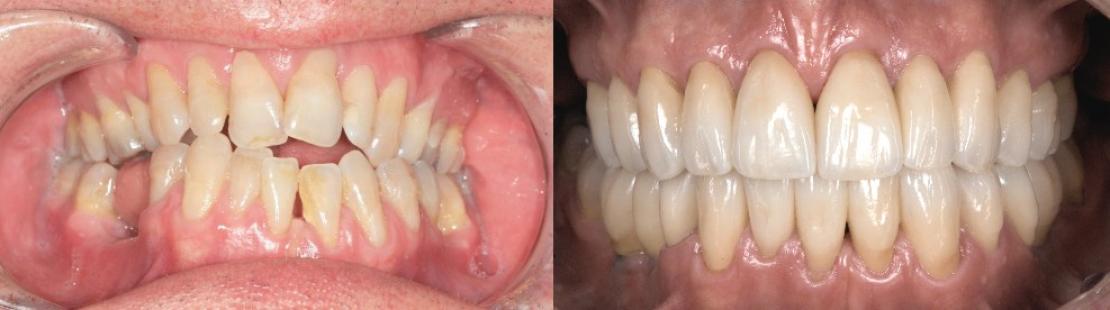 En fin de traitement pré-prothétique, une analyse globale de la nouvelle situation est réalisée pour élaborer un plan de traitement prothétique. Bien que l’occlusion obtenue soit stable et fonctionnelle, le sourire du patient reste disgracieux. La présence de trous noirs interproximaux, des anomalies de proportions, de nombreux composites de collet ainsi que quelques mylolyses restent préjudiciables au niveau esthétique.